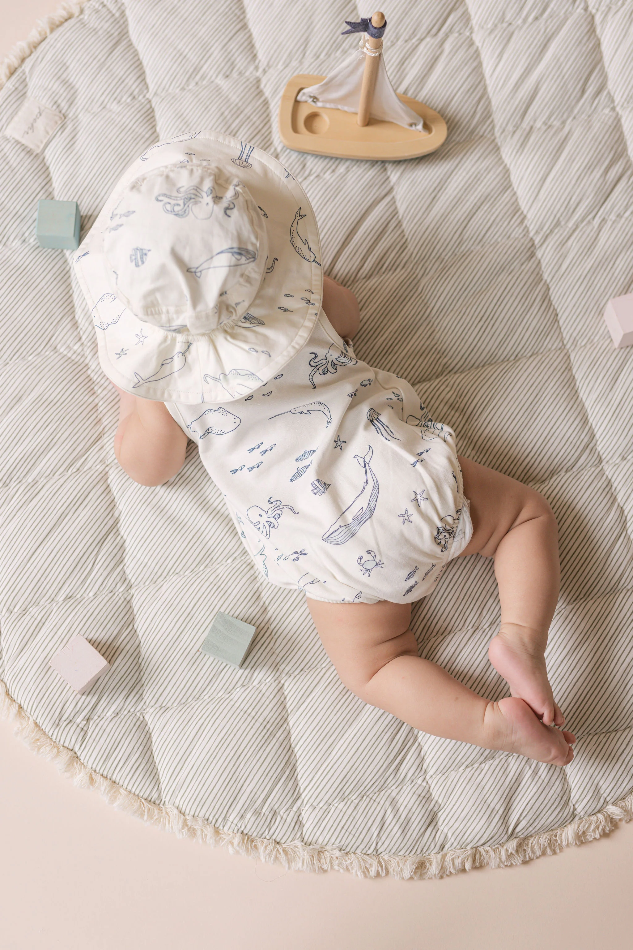 The ultimate summer accessory. Our Bucket Hat is a warm-weather essential they'll wear all summer long. Made from GOTS certified 100% woven organic cotton, it features an elastic back for a comfy fit and a sturdy yet flexible brim to help shield little faces from the sun. Baby sizes (0m - 24m) include a chin strap for a security, while toddler sizes (2T - 5T) are strap-free for easy on and off. 'Pehr’ it with matching One-Pieces, Bottoms and Dresses for a head to toe look.