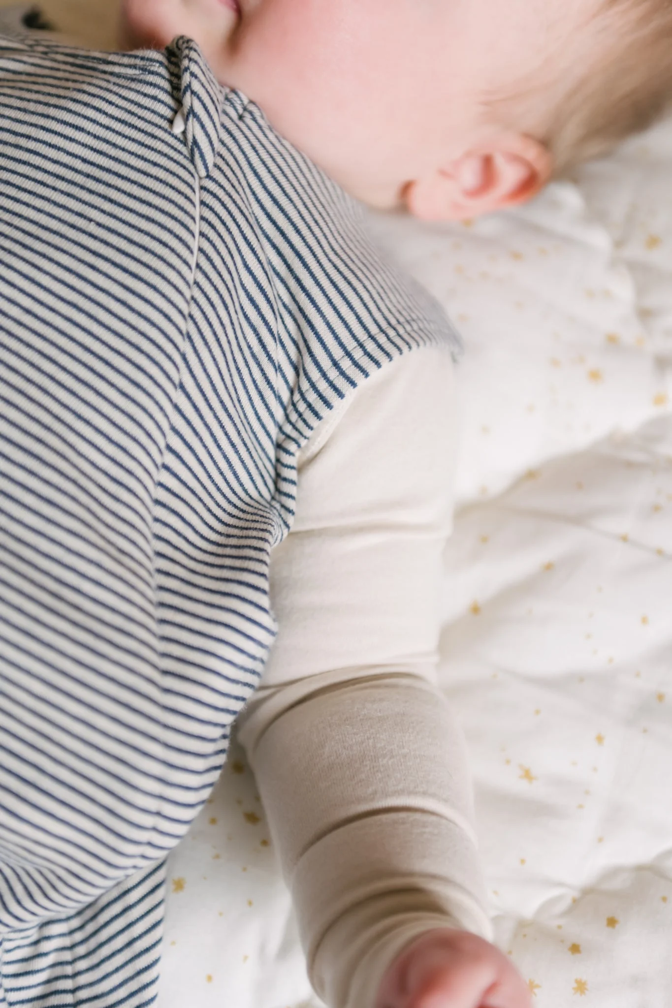 Soft, cozy, and just the right weight. Our 1.0 TOG Sailor Stripe Sleep Bag is crafted from GOTS certified organic cotton in a double-layered knit for all-season comfort. Designed for room temperatures of 75–81°F (24–27°C), it features a full-length invisible zipper for easy changes, while a reverse stripe interior adds a subtle, thoughtful touch.